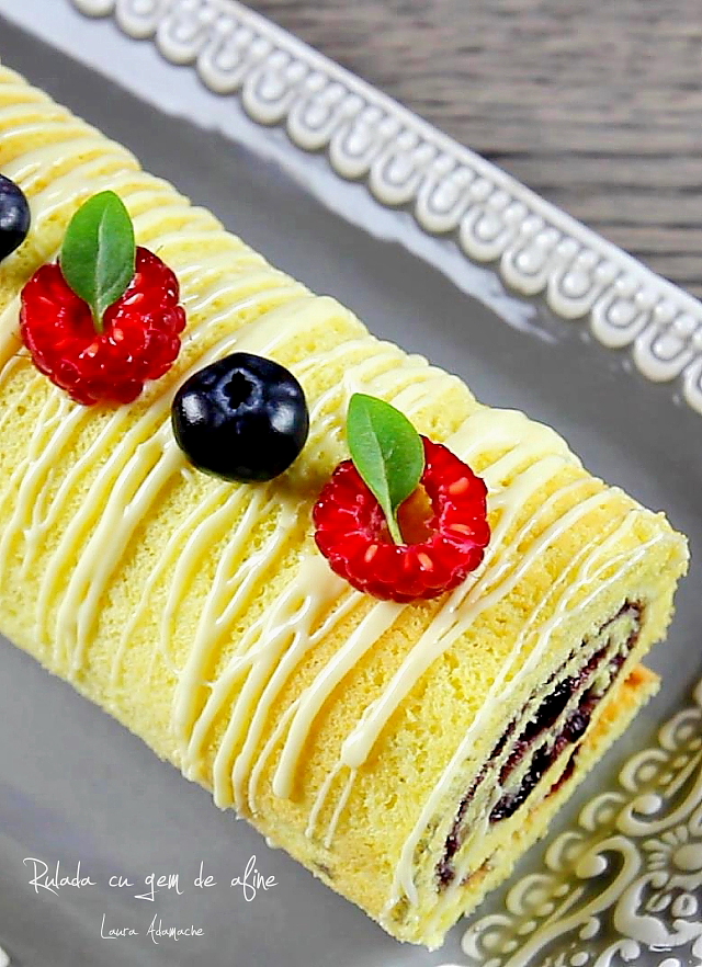 Separamos las claras de las yemas y las ponemos en dos recipientes separados. Añadimos el azúcar a las yemas y las semillas de la vaina de vainilla y batimos hasta que se aclaren y doblen su volumen. Añadimos la sal a las claras y las batimos hasta que no se caigan de las varillas de la batidora. Añadimos, en 2-3 veces, las yemas a las claras y mezclamos con cuidado, de abajo hacia arriba. Tamizamos la harina directamente sobre la composición obtenida. Mezclamos de nuevo, con cuidado, de abajo hacia arriba, hasta homogeneizar. Engrasamos una bandeja con un poco de mantequilla y papel de hornear y añadimos la composición. La nivelamos con cuidado y horneamos el rollo en el horno precalentado a 180°C durante 10-12 minutos. Volcamos la base del rollo sobre un papel de hornear húmedo y retiramos con cuidado el papel de hornear caliente. Lo envolvemos con cuidado en el papel de hornear húmedo, apretamos los extremos y luego envolvemos el rollo en un paño de algodón húmedo. Dejamos que el rollo se enfríe por completo, luego retiramos el paño y el papel de hornear. Untamos la superficie del rollo con la mermelada de arándanos y lo enrollamos con cuidado. Envolvemos el rollo en film de plástico alimentario y lo metemos en el frigorífico durante 30 minutos. Después del reposo, adornamos el rollo con chocolate blanco derretido y frutas, arándanos y frambuesas, o lo espolvoreamos con azúcar avainillado. Lo cortamos en rodajas y lo servimos con gusto. ¡Está delicioso!